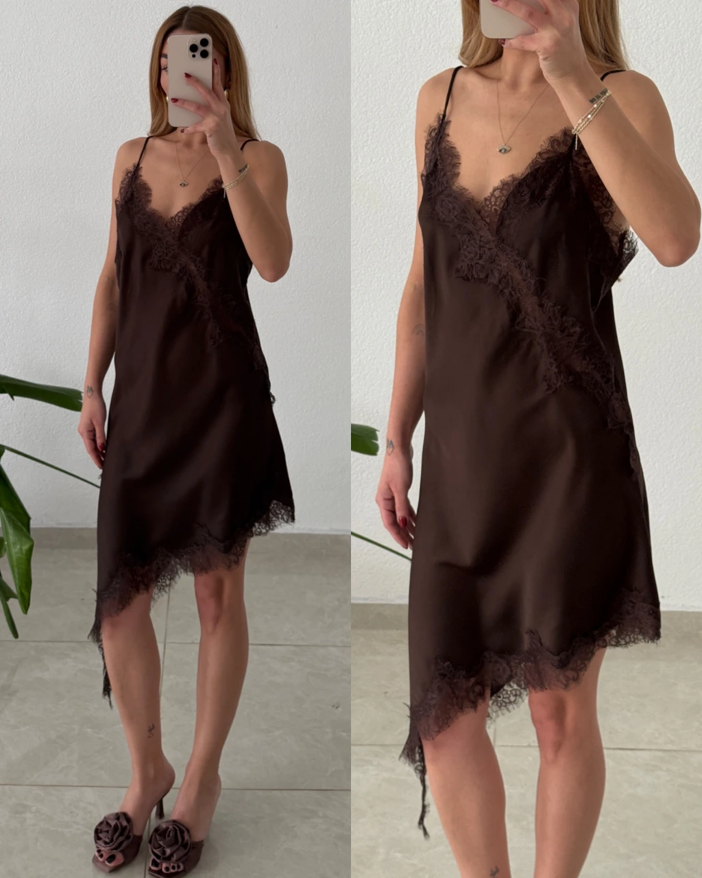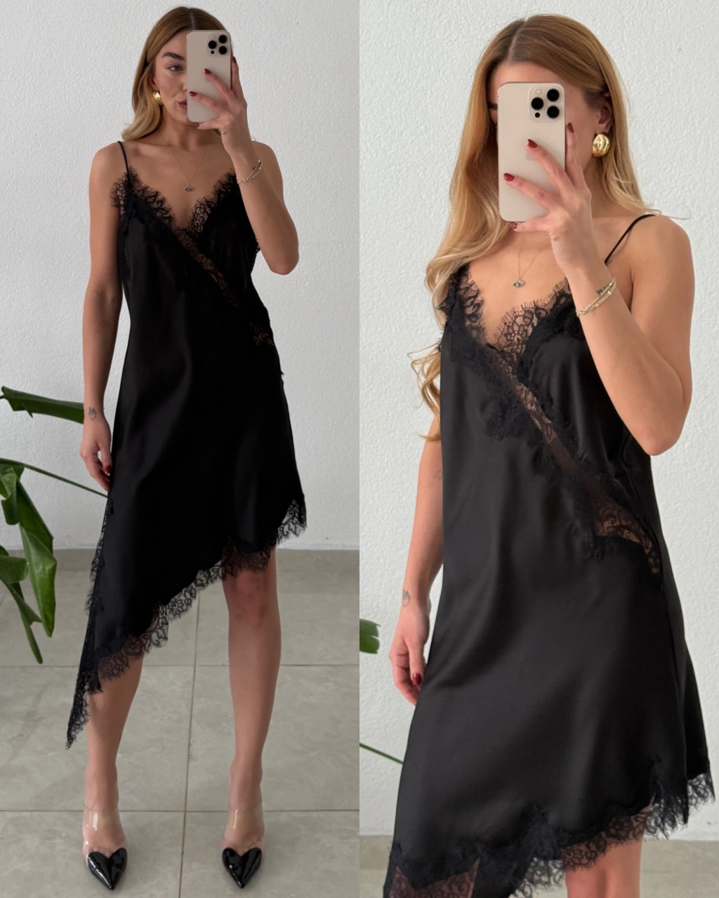 Asimetrik Dantel Detaylı Saten Elbise