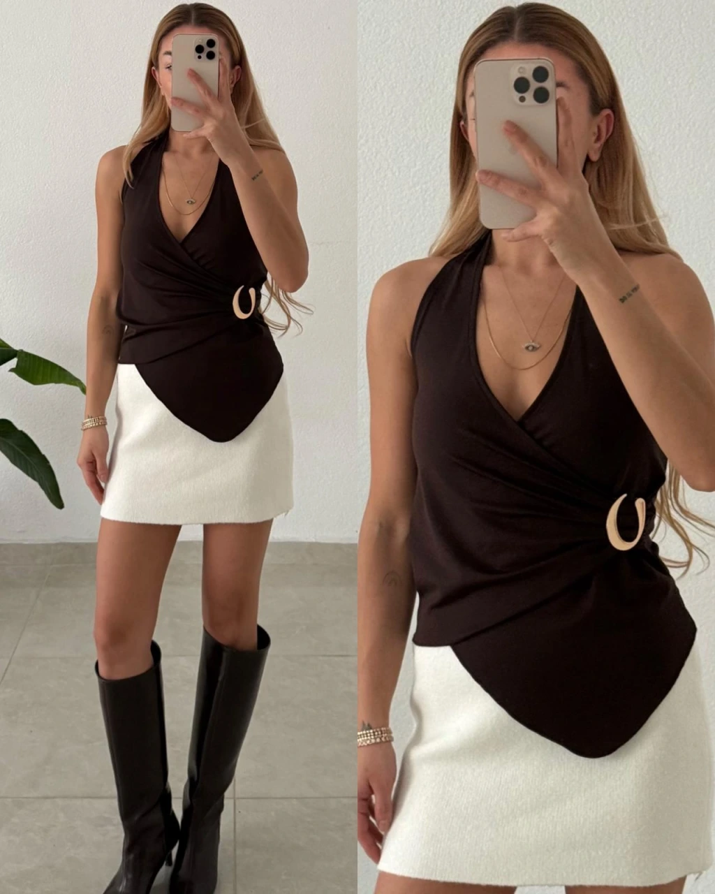 Yüksek bel pantolon, etek veya şık bir jean ile kolayca uyum sağlar. Topuklu ayakkabı ve minimal takılarla daha iddialı; sneaker ile daha günlük bir görünüm elde edebilirsin.