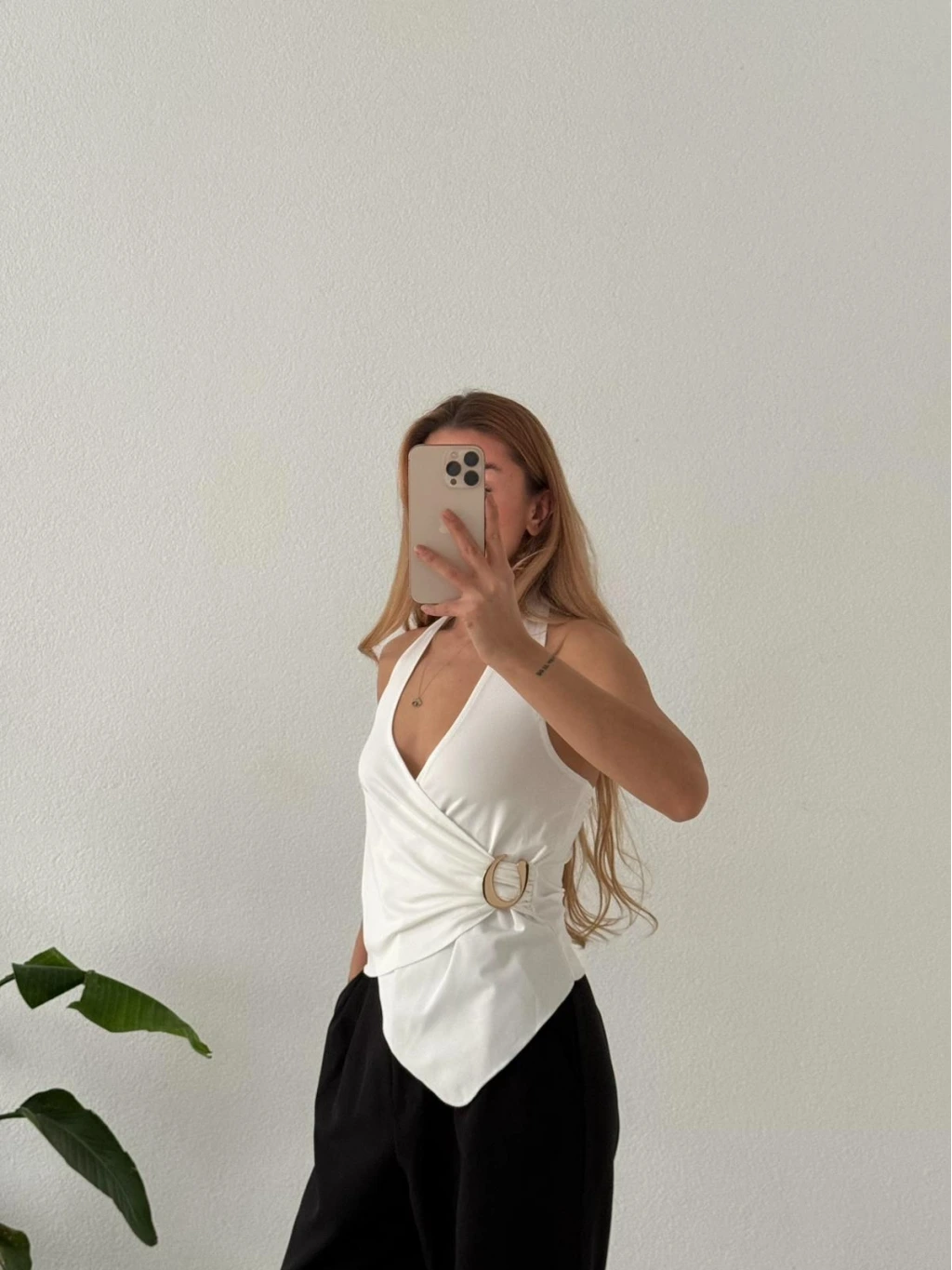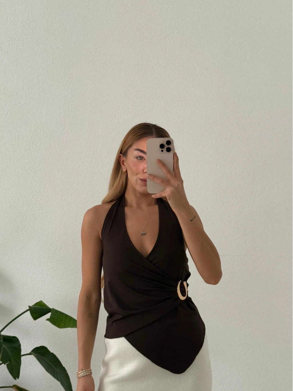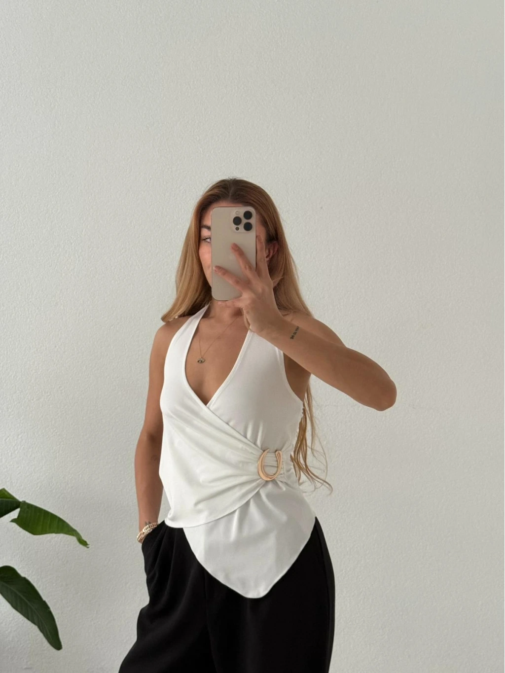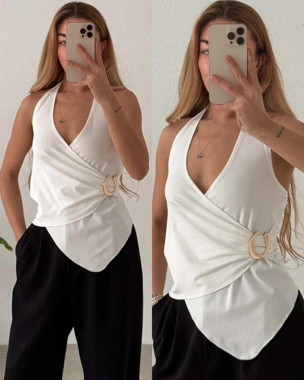 Modern çizgisiyle öne çıkan bu bluz; asimetrik kruvaze yaka formu ve boyundan geçmeli aksesuar detayıyla kombinlerine anında şıklık katar. Günlük stilini yükseltmek ya da özel anlarda zarif bir görünüm yakalamak için ideal bir parçadır.