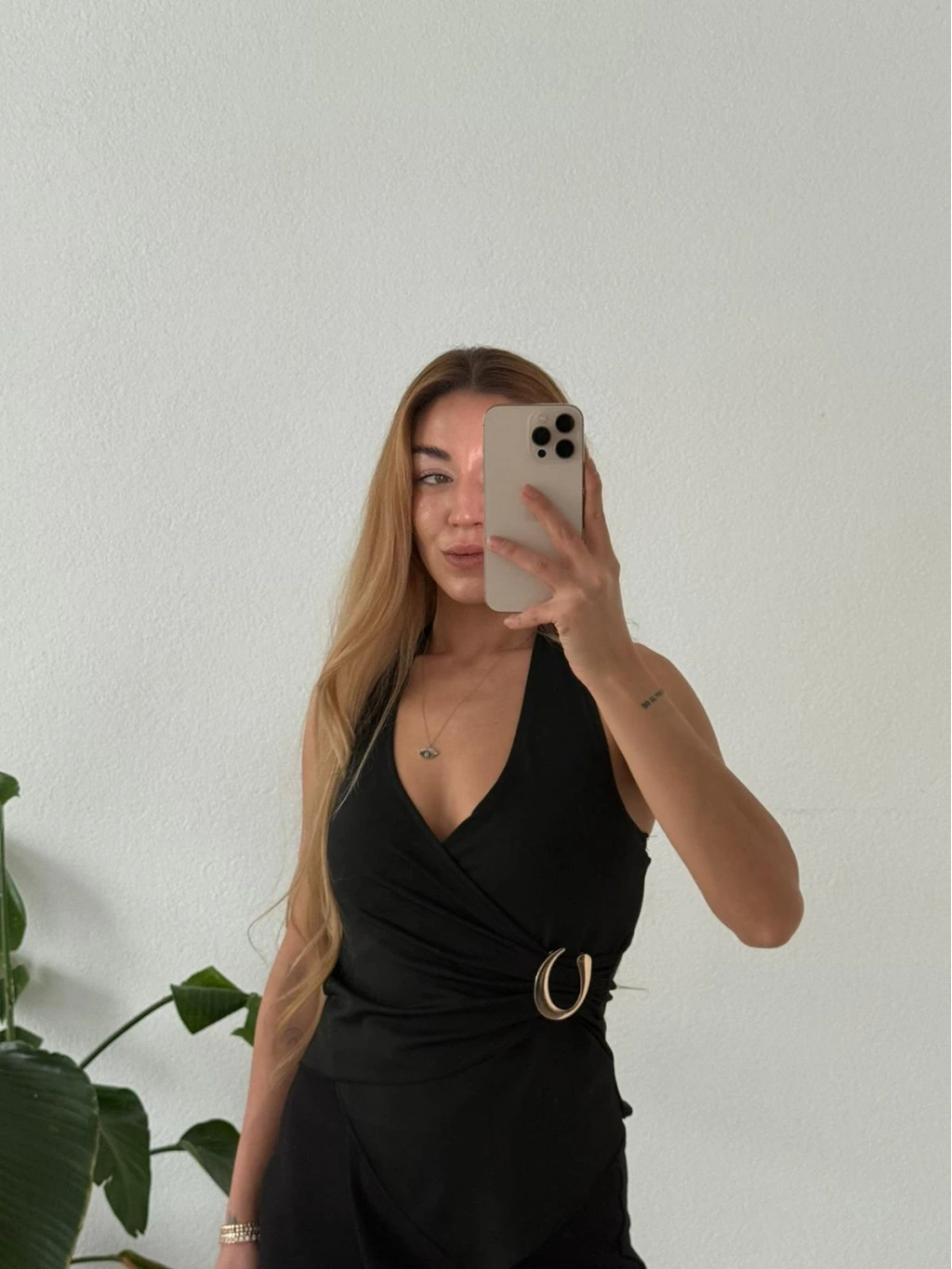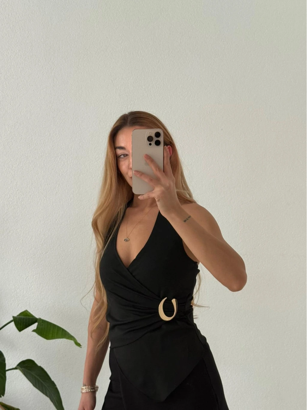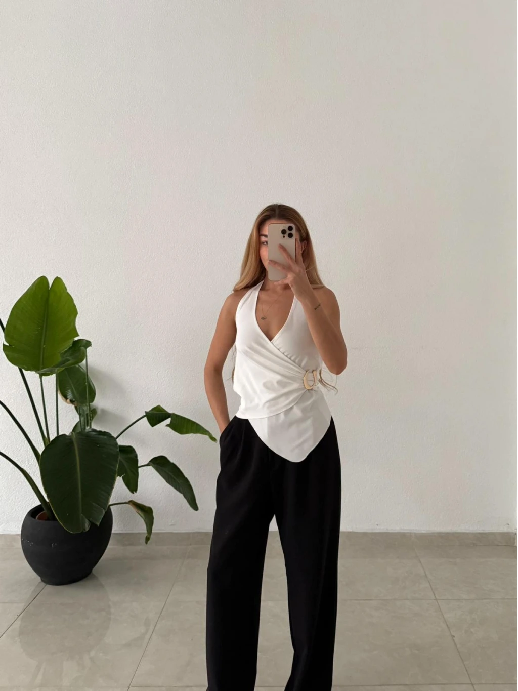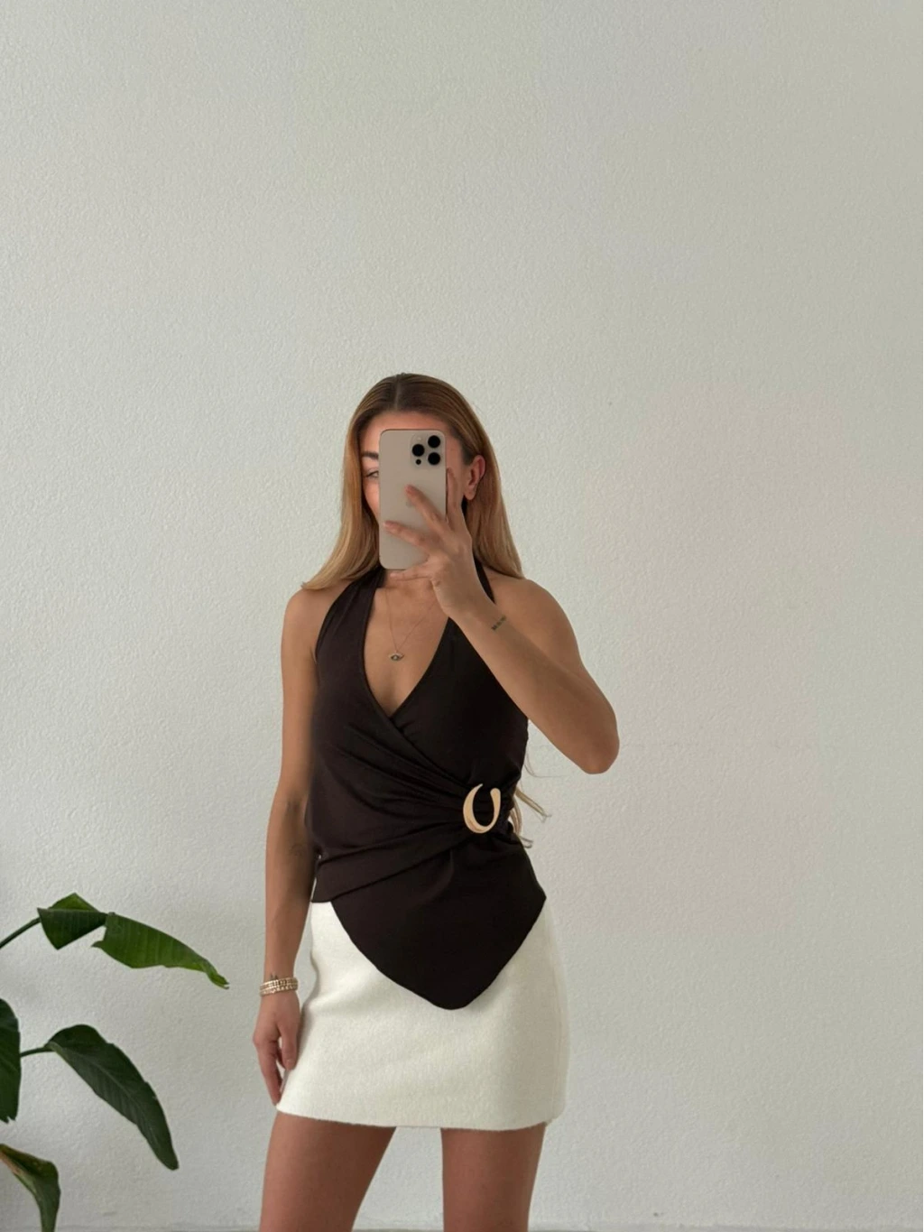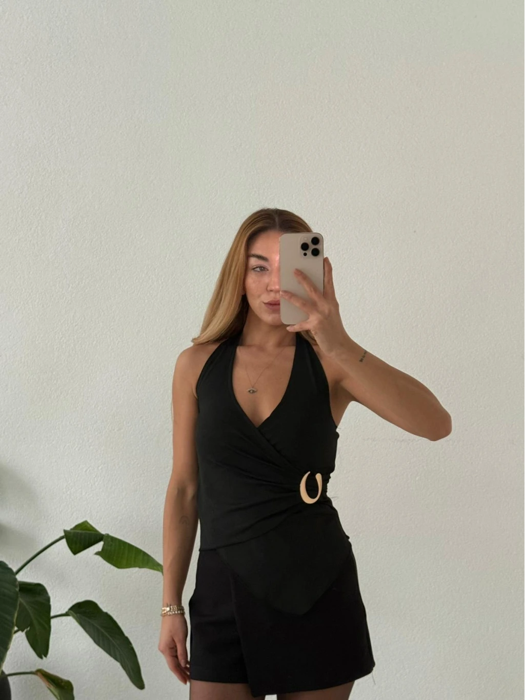 Modern çizgisiyle öne çıkan bu bluz; asimetrik kruvaze yaka formu ve boyundan geçmeli aksesuar detayıyla kombinlerine anında şıklık katar. Günlük stilini yükseltmek ya da özel anlarda zarif bir görünüm yakalamak için ideal bir parçadır.