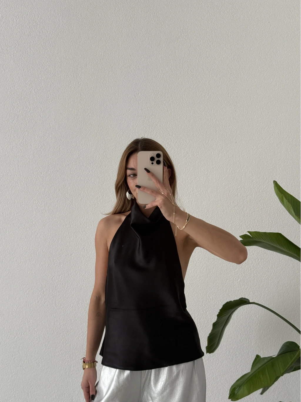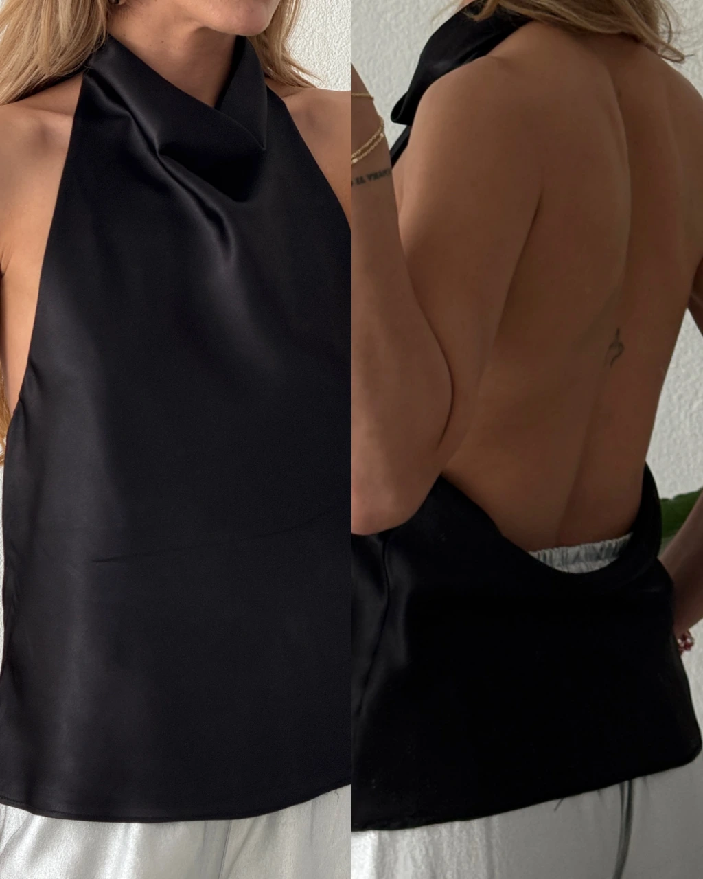 Degaje Yaka Sırt Dekolteli Saten Bluz