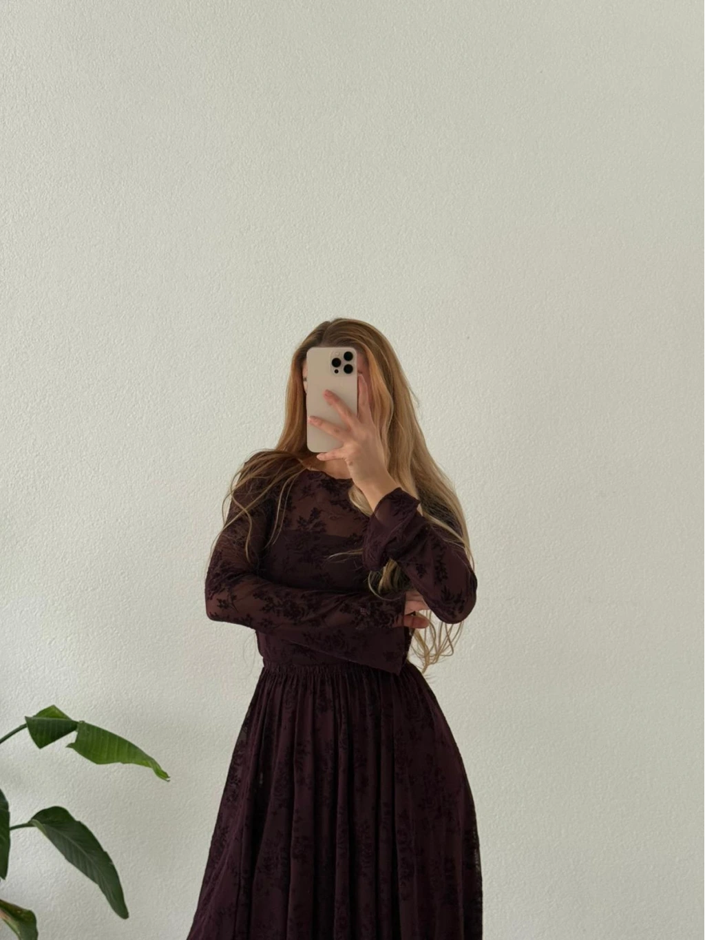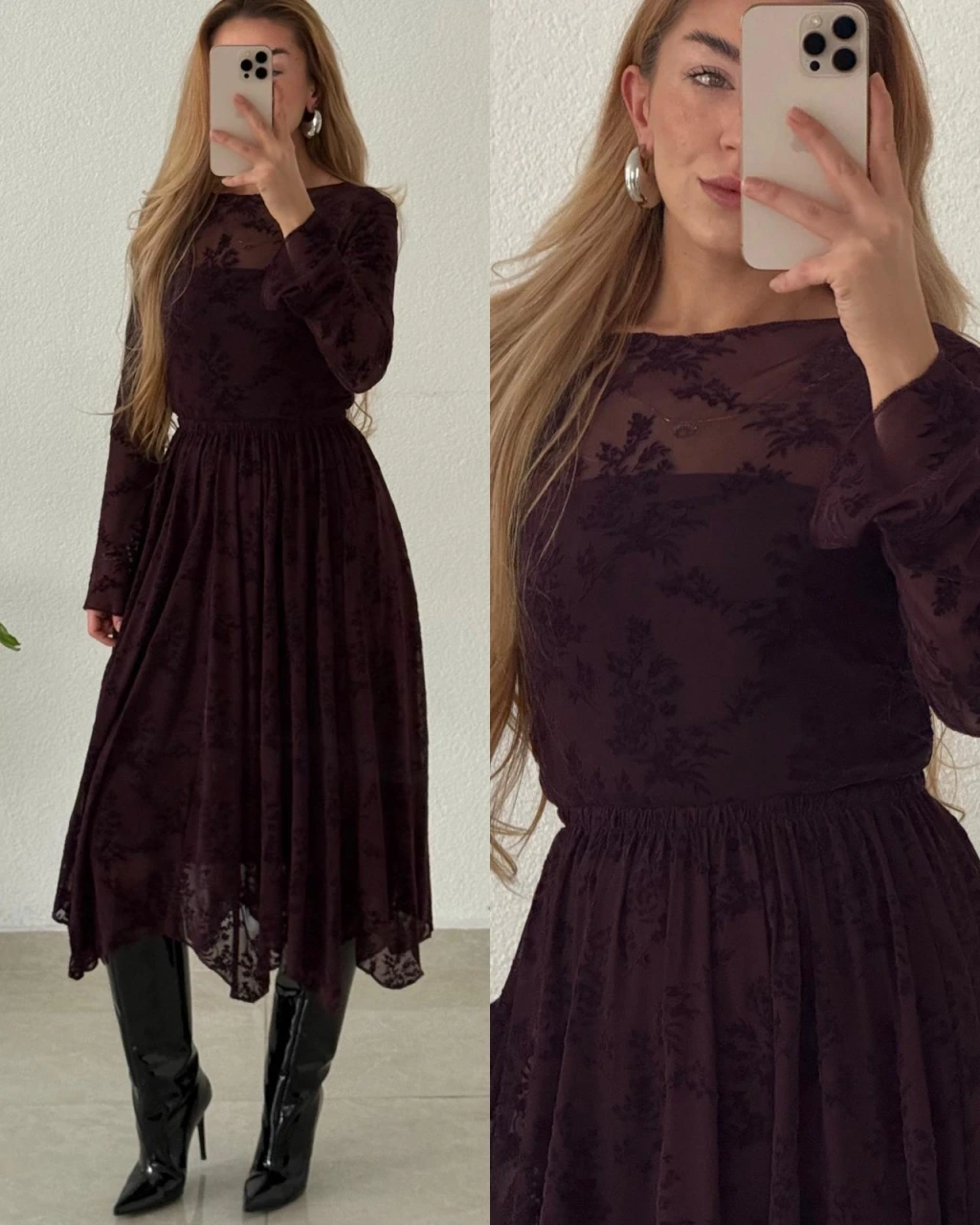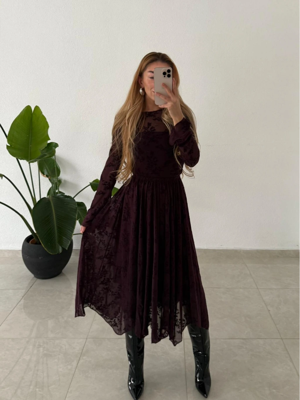 Şıklığı tek parçada yükselten bu flok baskılı, kadife dokulu ve astarlı kloş etek; romantik desen etkisi ve akışkan duruşuyla gün boyu konfor + zarafet sunar. Bel lastiği sayesinde rahatça uyum sağlar; kloş formu ile hareket ettikçe çok şık bir siluet verir.