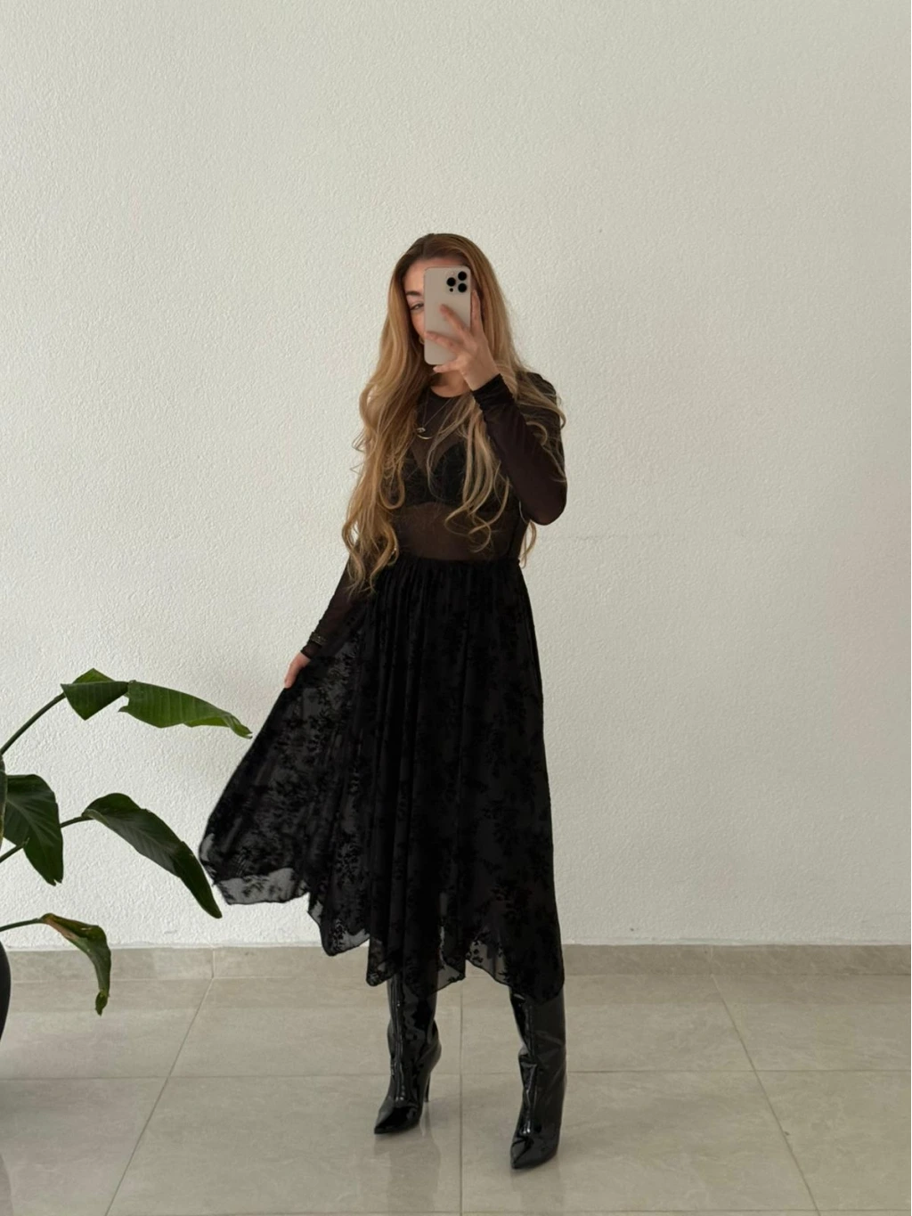 Flok Baskılı Kadife Dokulu Astarlı Kloş Midi Etek