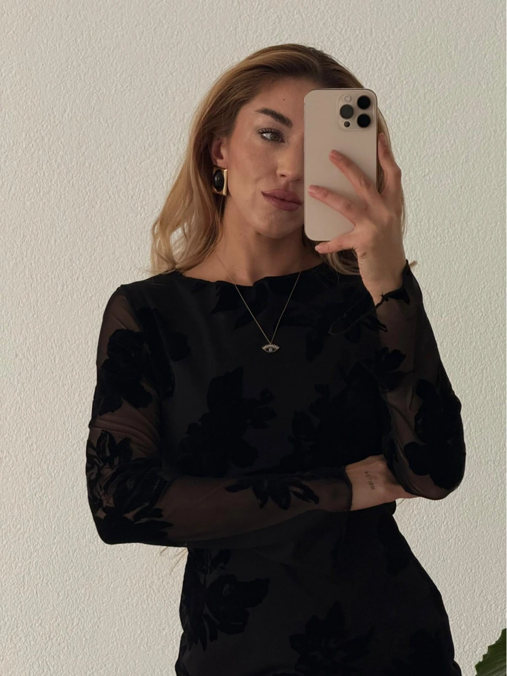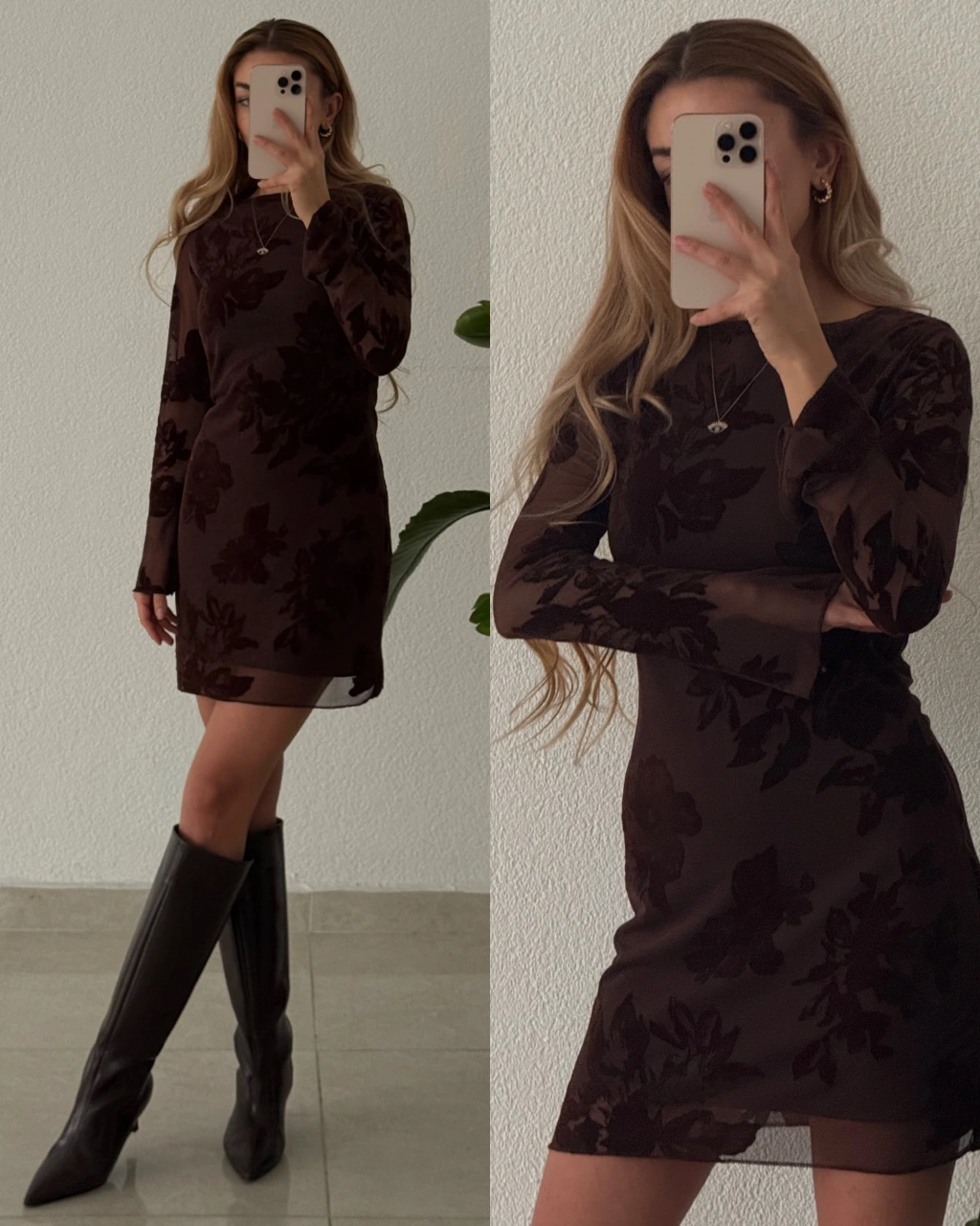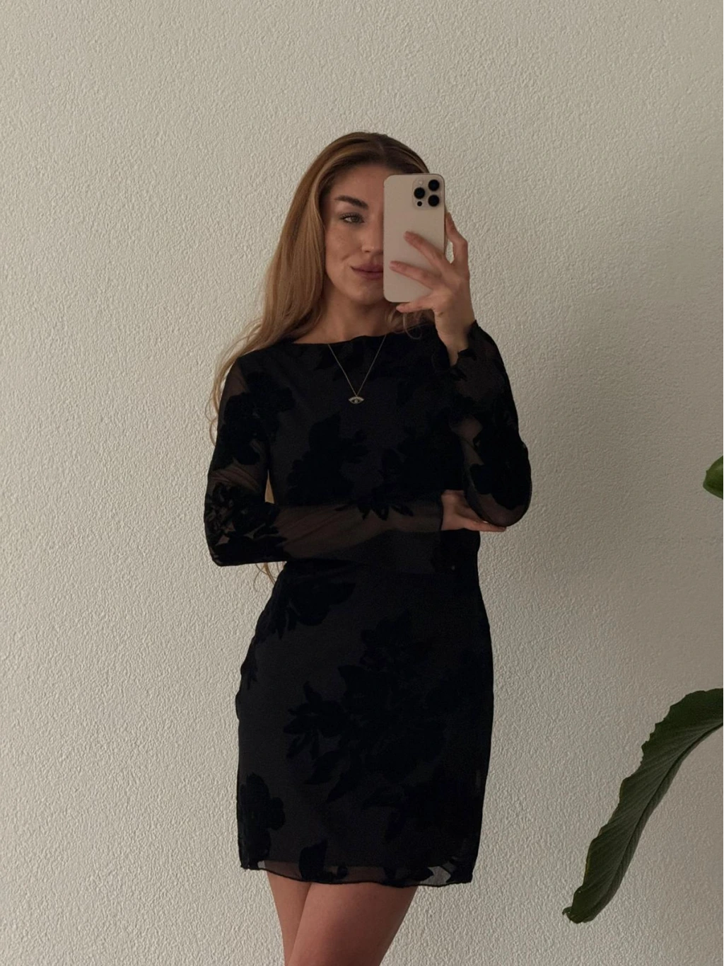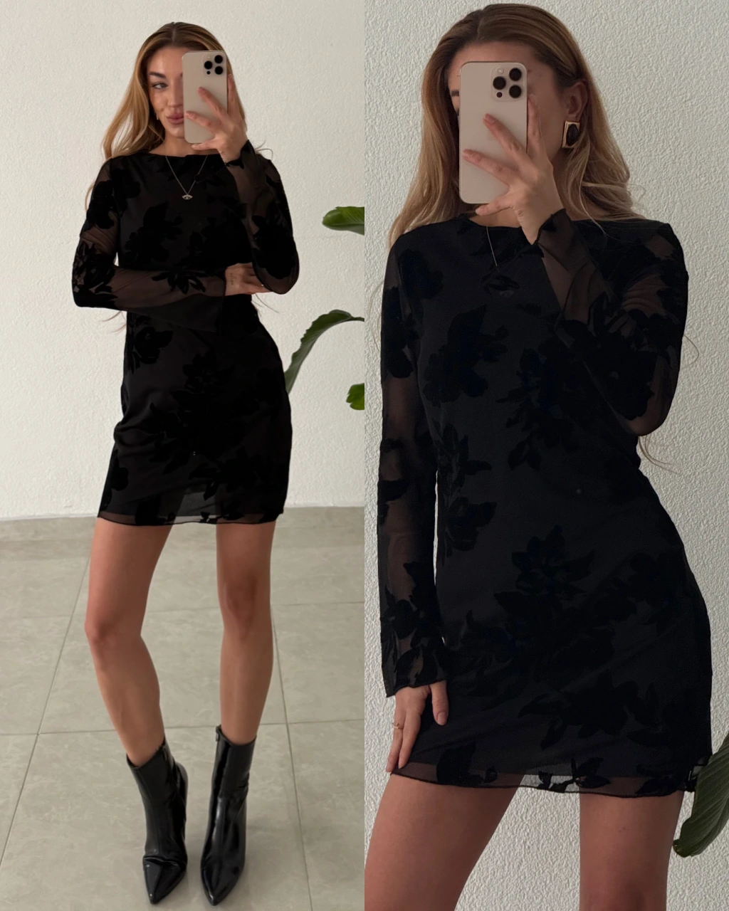 Zarafetin ve modern şıklığın kusursuz bir birleşimi olan Kadife Flok Baskılı Tül Mini Elbise ile tüm gözler üzerinizde olacak. Siyahın asaletini, tülün romantik dokusunu ve kadifenin lüks hissini bir araya getiren bu eşsiz tasarım, özel anlarınız için vazgeçilmez bir parça olmaya aday. Vücudu saran fit kesimi ve diz üstü mini boyuyla feminen bir silüet sunarken, uzun kollardaki transparan detaylar gizemli ve çekici bir hava katıyor.