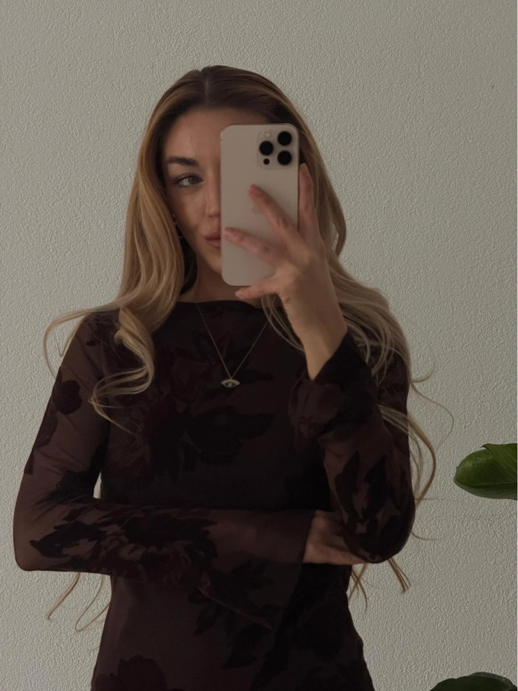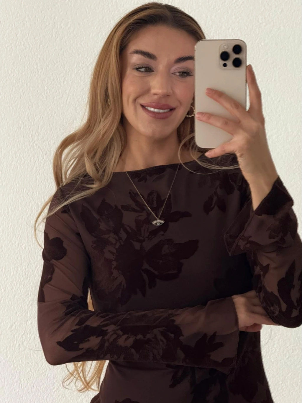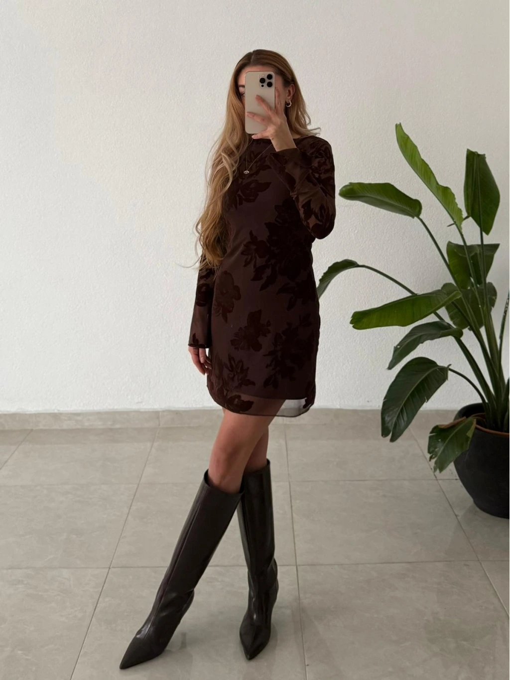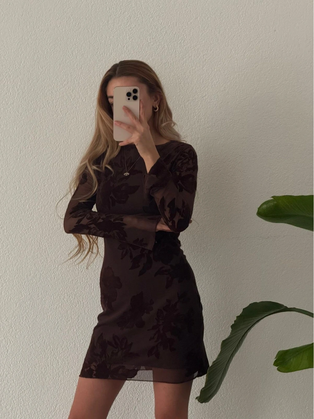 Zarafetin ve modern şıklığın kusursuz bir birleşimi olan Kadife Flok Baskılı Tül Mini Elbise ile tüm gözler üzerinizde olacak. Siyahın asaletini, tülün romantik dokusunu ve kadifenin lüks hissini bir araya getiren bu eşsiz tasarım, özel anlarınız için vazgeçilmez bir parça olmaya aday. Vücudu saran fit kesimi ve diz üstü mini boyuyla feminen bir silüet sunarken, uzun kollardaki transparan detaylar gizemli ve çekici bir hava katıyor.
