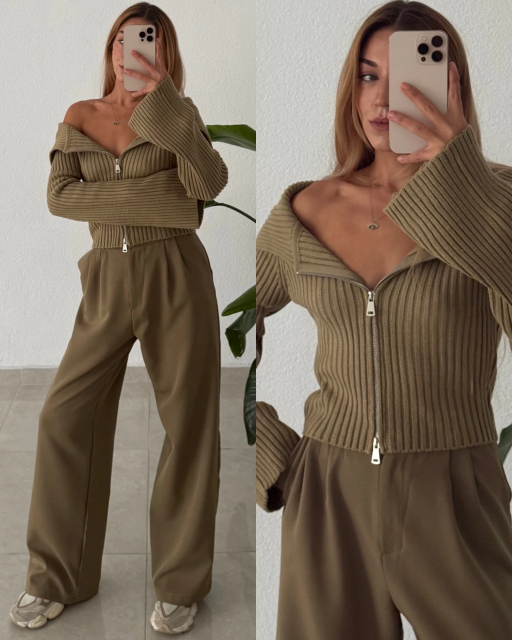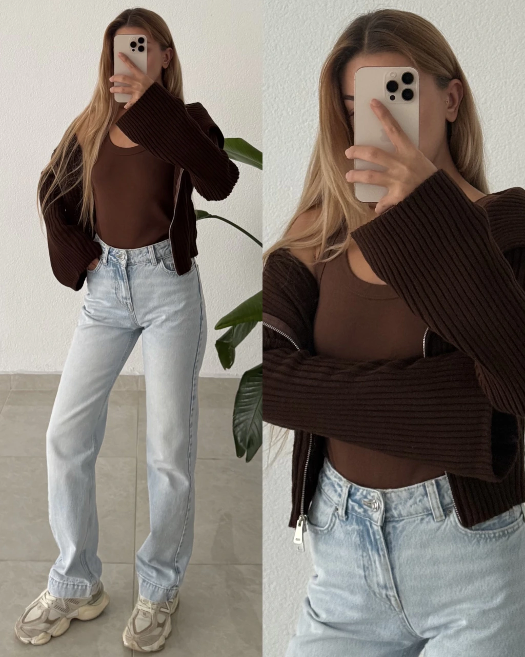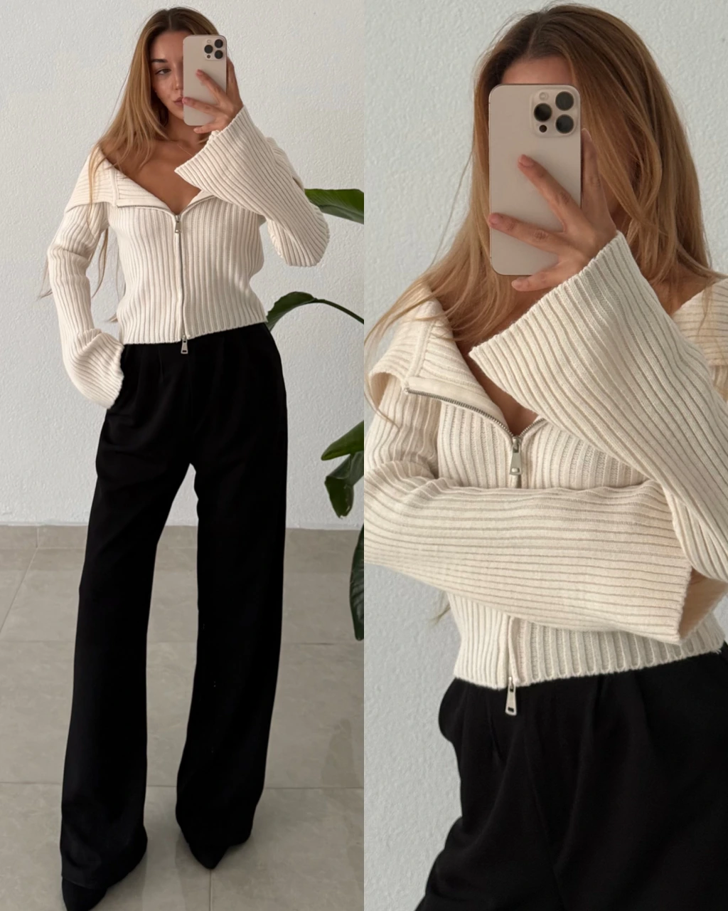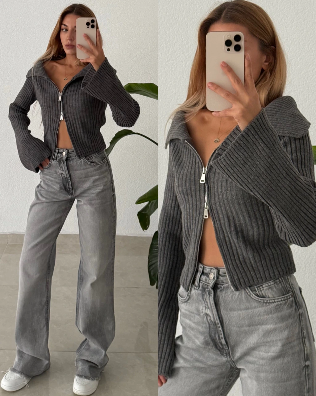 Madonna Yaka Fermuarlı Triko Kazak/Hırka