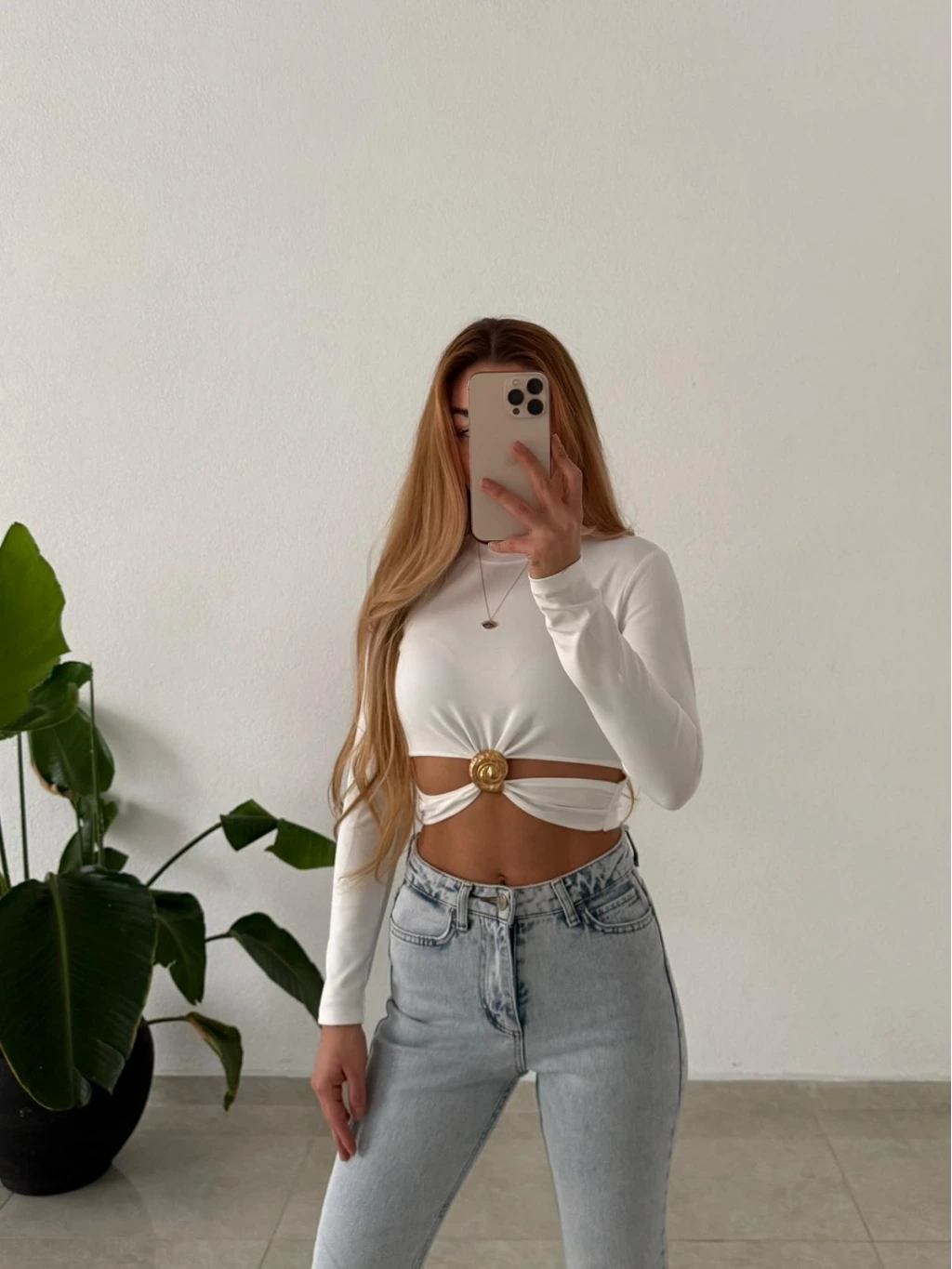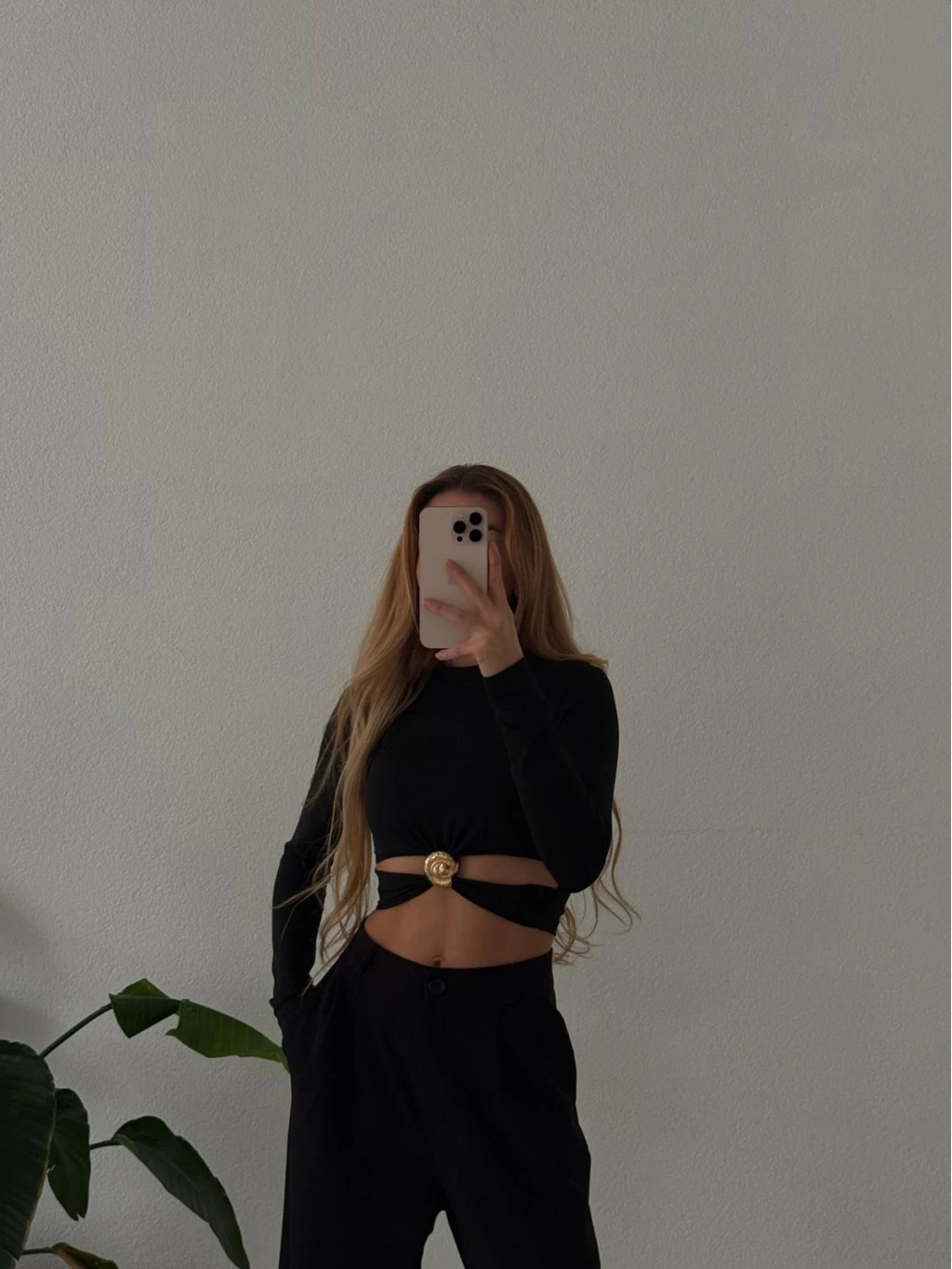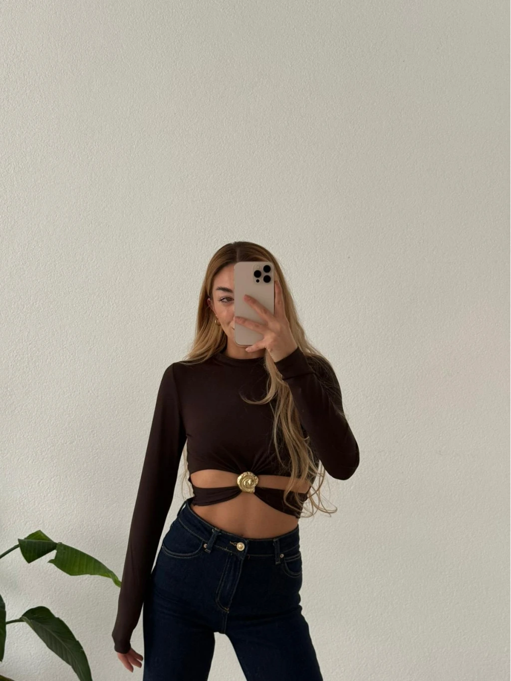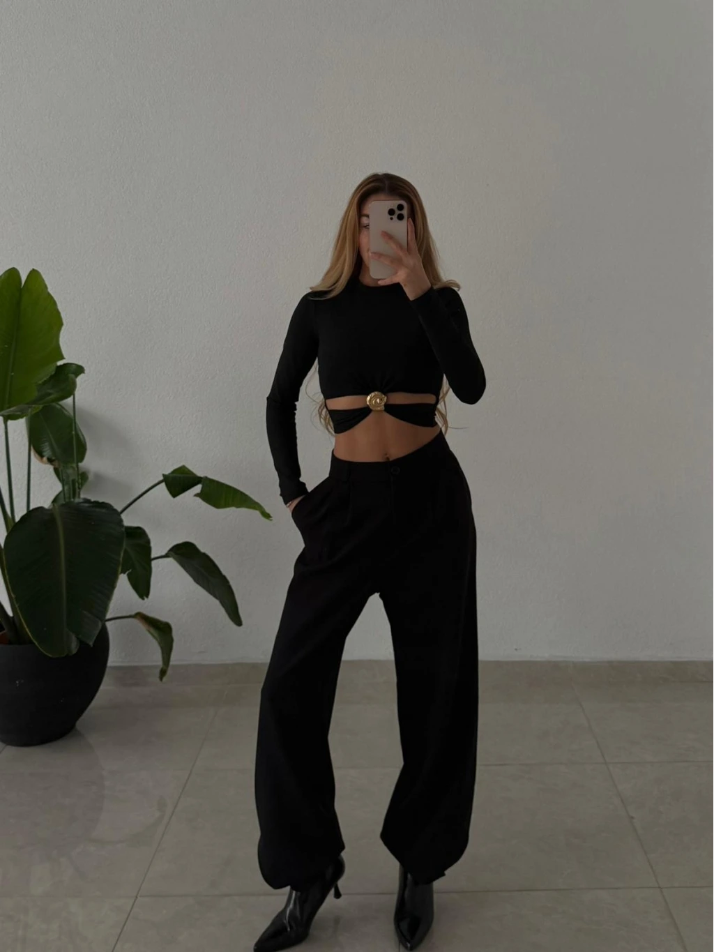 Stilini tek hamlede yükselten bu pencereli (cut-out) tasarım, göğüs altındaki salyangoz form aksesuar detayı ile çok şık ve iddialı bir görünüm sunar. Uzun kollu yapısı sayesinde hem gece kombinlerinde hem de günlük şıklıkta rahatça kullanılır. Crop boyu bel hattını vurgular, fit duruşu ile modern bir siluet oluşturur.