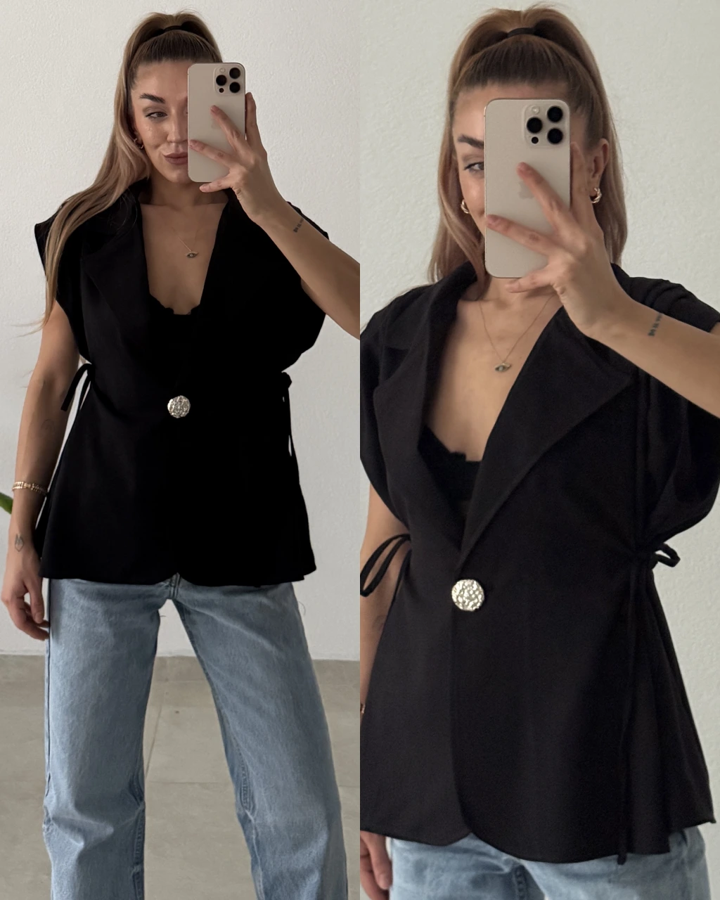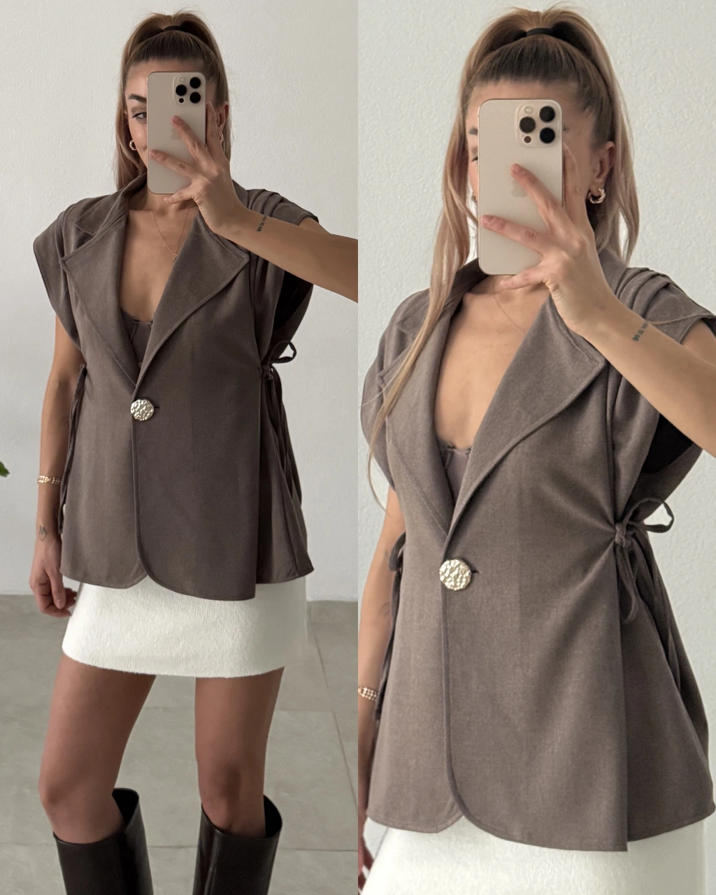 Modern ve güçlü bir görünüm sunan bu yelek modeli, pile detayıyla form kazanırken yan bağcıkları sayesinde vücuda göre ayarlanabilir duruş sağlar. Düğme detayı ürüne minimal ama dikkat çekici bir hava katarken, hem günlük kombinlerde hem de daha klasik stillerde rahatlıkla kullanılabilir.