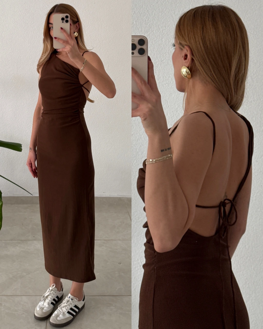 Sırt Dekolteli Midi Boy Kahverengi Elbise